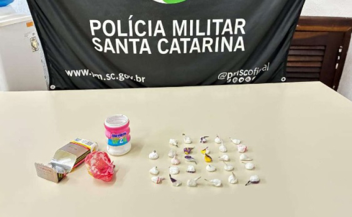Durante rondas na região, a Polícia Militar flagrou a jovem em atitude suspeita. Na abordagem, os policiais encontraram 28 buchas de cocaína, totalizando aproximadamente 19,6 gramas da droga.