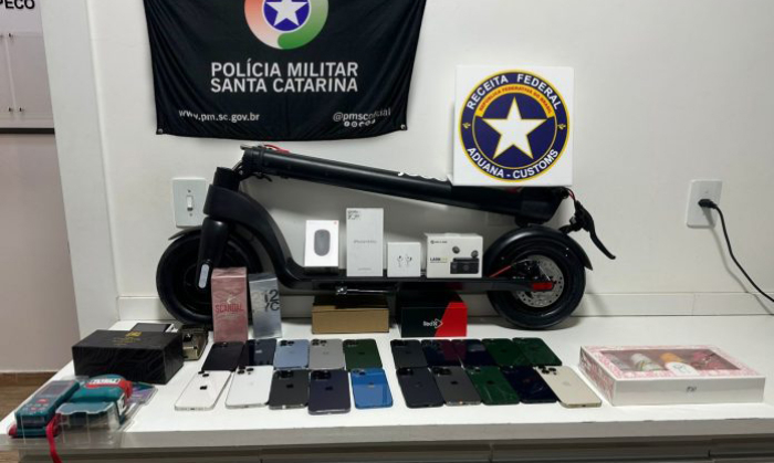 Na vistoria, os agentes encontraram em uma mochila preta 21 smartphones da marca Apple, de modelos variados, além de um patinete elétrico, perfumes e outros eletrônicos, todos sem a devida documentação aduaneira.