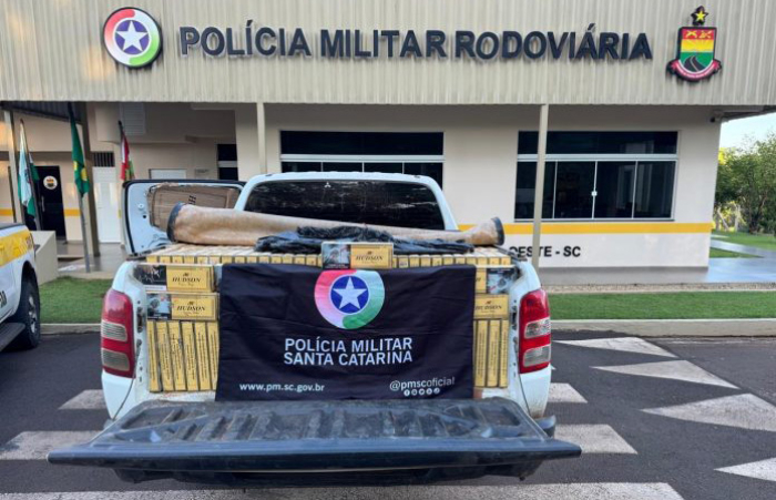 O veículo foi encontrado abandonado - Foto: Reprodução A Polícia Militar Rodoviária (PRE) apreendeu, na madrugada desta terça-feira, 04 de novembro, uma caminhonete carregada com aproximadamente 25 mil maços de cigarros contrabandeados. A ação ocorreu por volta das 5h, na SC-283, em Caibi, durante patrulhamento da equipe de Iporã do Oeste.