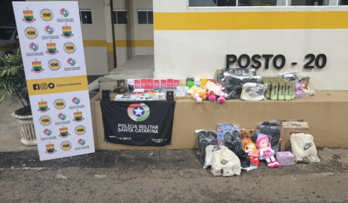 Material será encaminhado à Receita Federal - Foto: Reprodução A Polícia Militar Rodoviária apreendeu, na noite desta quarta-feira, 19 de novembro, uma grande quantidade de produtos de origem estrangeira durante uma operação de fiscalização na SC-283, em Concórdia. A ocorrência foi registrada às 21h, no km 21,950 da rodovia, em frente ao Posto 20.