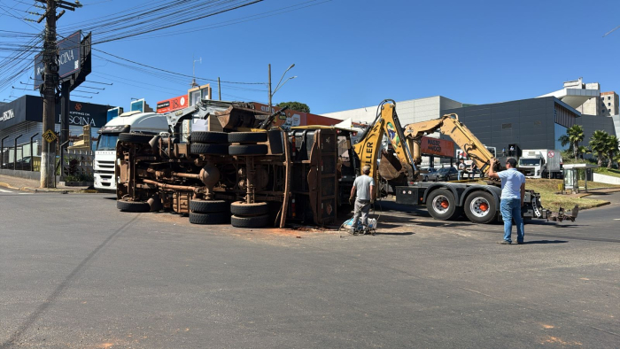 O acidente ocorreu na Avenida Fernando Machado, na rótula com a Rua Xanxerê, nas proximidades do Shopping Pátio Chapecó. No local, uma caçamba Iveco que transportava uma retroescavadeira acabou tombando durante uma manobra.