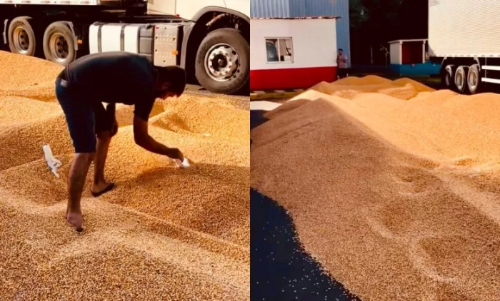 De acordo com o próprio motorista, a situação foi resolvida cerca de 30 minutos após o despejo da carga - Foto: Reprodução Um caminhoneiro despejou uma carga inteira de milho no pátio de uma empresa em Chapecó como forma de protesto contra a demora para descarregar o veículo. O motorista, conhecido como Baturé, aguardava há mais de uma semana pela liberação, que segundo ele, era constantemente adiada por problemas administrativos da empresa.