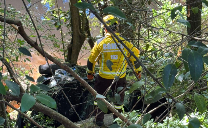 No local, os socorristas confirmaram a saída de pista seguida de tombamento. O veículo ficou lateralizado e preso entre árvores após a queda na ribanceira.