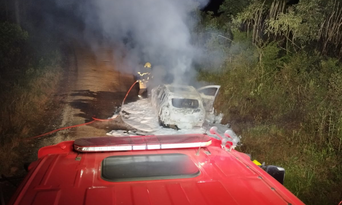 Incêndio atingiu completamente um Renault Sandero - Foto: Reprodução Um incêndio em veículo mobilizou equipes de emergência na noite desta terça-feira, 16 de dezembro, por volta das 21h11, na comunidade de Linha Guarani, no interior do município de Capinzal, no Meio-Oeste catarinense.