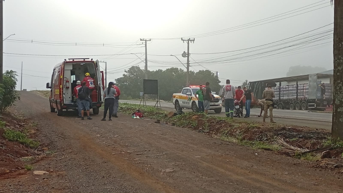 Acidente ocorreu no distrito de Santo Antônio - Foto: Reprodução Um homem de 24 anos ficou gravemente ferido após uma colisão entre um caminhão e uma motocicleta às margens da SC-283, no distrito de Santo Antônio, em Concórdia. O chamado para atendimento da vítima ocorreu por volta das 7h desta quinta-feira, 19 de fevereiro.