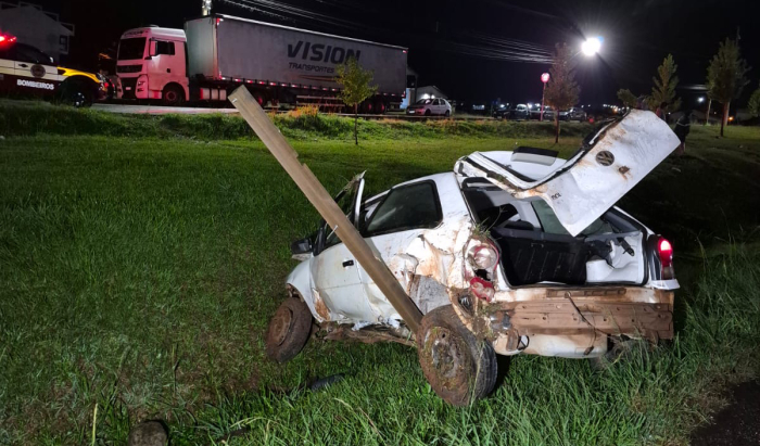 O condutor do veículo foi encontrado fora do automóvel, a cerca de 20 metros de distância - Foto: Reprodução Um grave acidente de trânsito foi registrado na noite deste domingo, 12 de abril, por volta das 20h30, na BR-282, em Ponte Serrada.