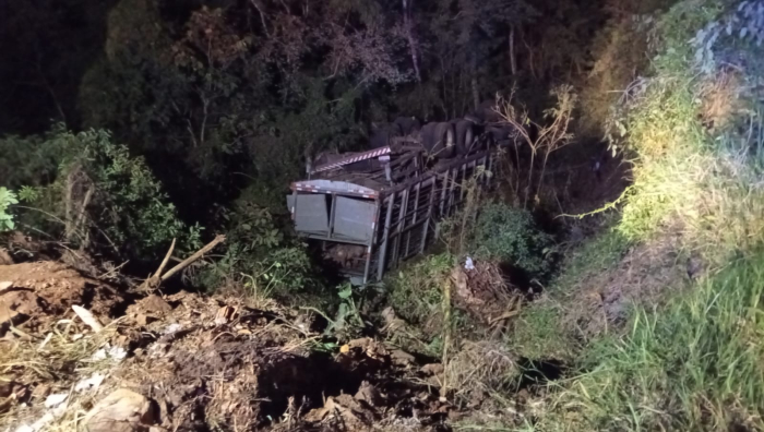 Veículo saiu da pista e caiu em uma ribanceira - Foto: Reprodução Um acidente de trânsito foi registrado na noite deste domingo, 05 de abril, no interior de Concórdia, mobilizando equipes de resgate após o tombamento de um caminhão carregado com suínos.
