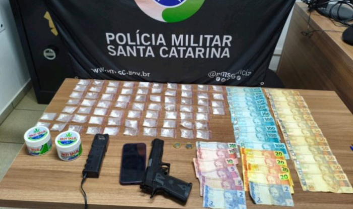 Polícia Militar encontrou 67 porções de cocaína, dinheiro e um simulacro de arma durante ação no Centro do município