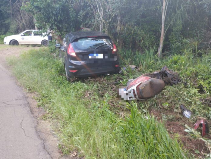 A motociclista sofreu fratura em uma das pernas - Foto: Reprodução Uma mulher ficou ferida após um acidente de trânsito envolvendo uma motocicleta e um automóvel na rodovia SC-464, no km 2, em Presidente Castello Branco, no Oeste de Santa Catarina. A colisão aconteceu por volta das 6h45 desta terça-feira, 13 de janeiro, na comunidade de Salto da Praia, nas proximidades da ACAPI Pesque e Pague.