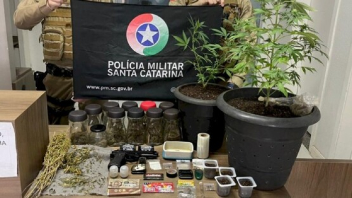 Durante as buscas, foram localizadas duas plantas cultivadas em uma estufa nos fundos do terreno - Foto: Reprodução A Operação Protetor resultou na apreensão de pés de maconha, frascos de skank, sementes e um simulacro de arma de fogo no centro de Pinhalzinho. A ação foi realizada pela Polícia Militar de Santa Catarina (PMSC), por meio do 2º Batalhão de Polícia Militar de Fronteira (BPM/Fron), após denúncia indicando possível atividade de tráfico de drogas em uma residência.