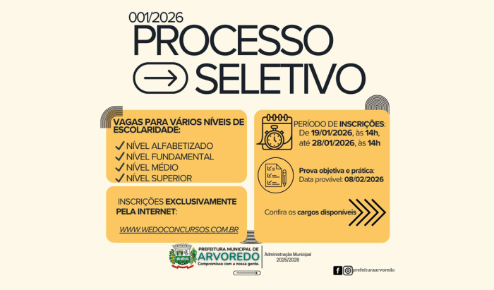 As provas objetivas e práticas estão previstas para ocorrer no dia 8 de fevereiro - Foto: Reprodução A Prefeitura de Arvoredo está com inscrições abertas para o Processo Seletivo nº 001/2026, que oferece vagas para candidatos de diferentes níveis de escolaridade, do alfabetizado ao ensino superior. Os interessados devem se inscrever exclusivamente pelo site da banca organizadora, www.wedoconcursos.com.br, até as 14h do dia 28 de janeiro.