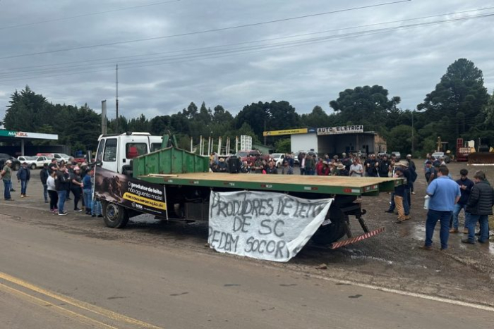 Durante o protesto, os produtores estenderam faixas com frases como “produtores de leite de SC pedem socorro” e “o produtor de leite não aguenta mais, pare com a importação já!”, destacando a insatisfação com a concorrência desleal dos produtos importados, os altos custos de produção e os baixos preços pagos pelo litro de leite.