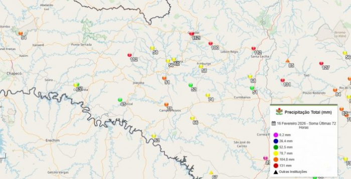 Em Campos Novos, o volume chegou a 80 milímetros, enquanto Concórdia somou 63 milímetros no período. Já em Capinzal, o acumulado foi de 45 milímetros.
