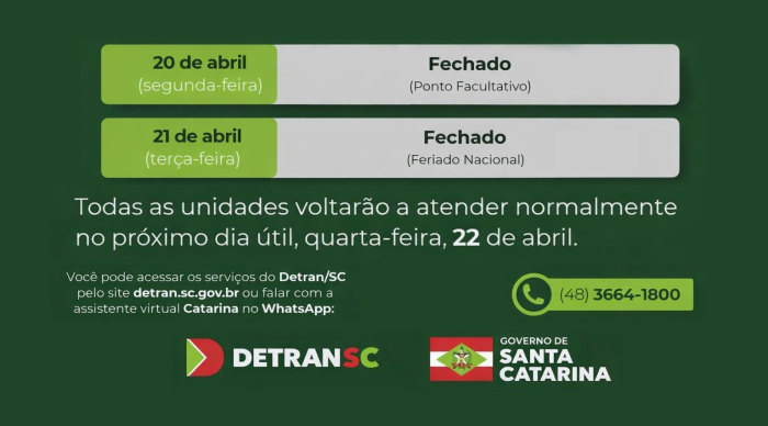 O atendimento normal será retomado na quarta-feira, dia 22 de abril - Foto: Reprodução O Departamento Estadual de Trânsito de Santa Catarina informou que o atendimento ao público será suspenso em todas as unidades do estado nos dias 20 e 21 de abril.