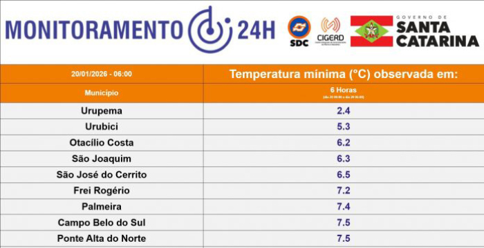 Urupema registrou a menor temperatura, com 2,4 °C. Em Urubici, os termômetros marcaram 5,3 °C. Otacílio Costa teve mínima de 6,2 °C, seguida por São Joaquim, com 6,3 °C, e São José do Cerrito, com 6,5 °C.