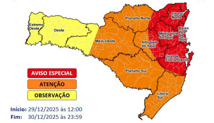 A Defesa Civil reforça a importância de acompanhar os alertas meteorológicos oficiais - Foto: Reprodução Após um final de semana marcado por temporais típicos de verão, Santa Catarina inicia a semana com reforço das instabilidades, principalmente no litoral e em regiões próximas. A atuação de uma área de baixa pressão próxima à costa favorece a intensificação das chuvas entre as tardes e noites de segunda-feira, 29 de dezembro e terça-feira, 30 de dezembro.