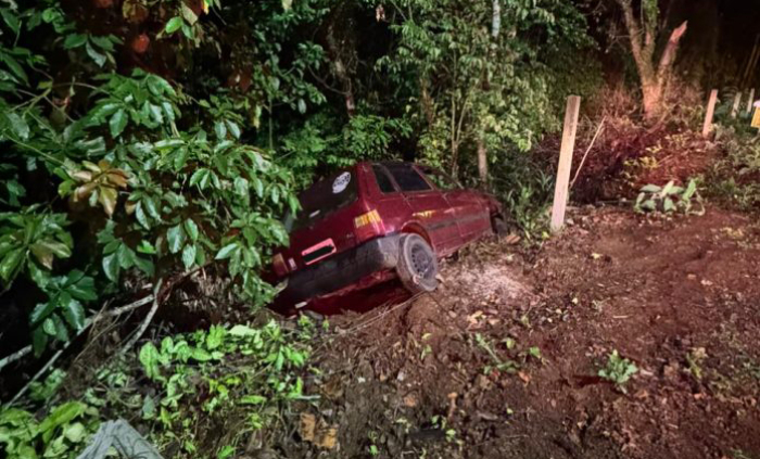 o automóvel foi sustentado pela vegetação - Foto: Reprodução O Corpo de Bombeiros Militar de Seara atendeu, por volta das 22h desta quarta-feira, 12 de novembro, uma ocorrência de saída de pista na Rua José Benetti, envolvendo um veículo de passeio.